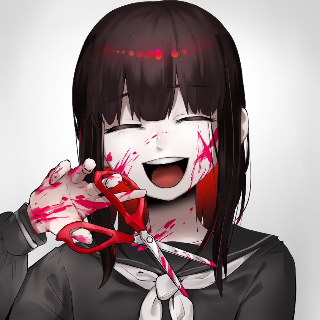 病みフリーヘッダー アイコン ねぎゅチュブ 病み垢 Pa Twitter 著作権フリー 加工 再配布可のフリー素材です 狂った笑顔のハサミ少女 アイコン 通常 アイコン 血 へいわに T Co K2l4ztennx 様から Skima で使用権ごと購入しました 病み垢